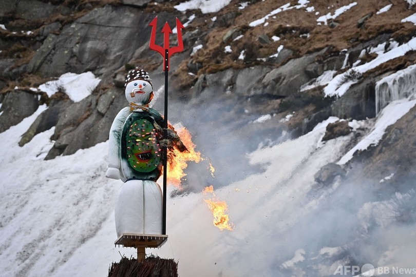 【4月20日 AFP】スイスの雪に覆われた山道に架かる橋で19日、チューリヒ伝統の春祭り「セクセロイテン(Sechselaeuten)」の儀式が行われ、まきの上に載せられた雪だるま形の巨大な人形が爆破された。