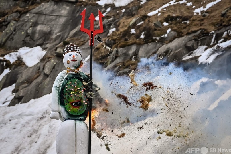 【4月20日 AFP】スイスの雪に覆われた山道に架かる橋で19日、チューリヒ伝統の春祭り「セクセロイテン(Sechselaeuten)」の儀式が行われ、まきの上に載せられた雪だるま形の巨大な人形が爆破された。