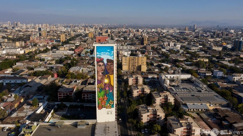 【4月30日 AFP】チリ・サンティアゴのユンガイ(Yungay)地区で撮影された、チリ人アーティストのSTFIレイトン(STFI Leigthon)さんがビルの側面に描いた高さ60メートルの壁画。「平等」というタイトルのこの作品は、靴メーカーが展開する「ジェンダー平等のため壁を破る」と題されたキャンペーンの一環として制作されたもので、石灰をベースにした環境に害のない塗料が用いられており、乾く間に二酸化炭素を吸収し、汚染物質を減らす配慮もされている。(c)AFP