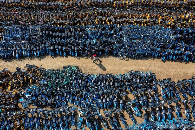 打ち捨てられた自転車には、ハローバイク(Hellobike)、滴滴(Didi)、美団(Meituan)など、同国のシェアサイクル事業を独占した企業のロゴが見える。