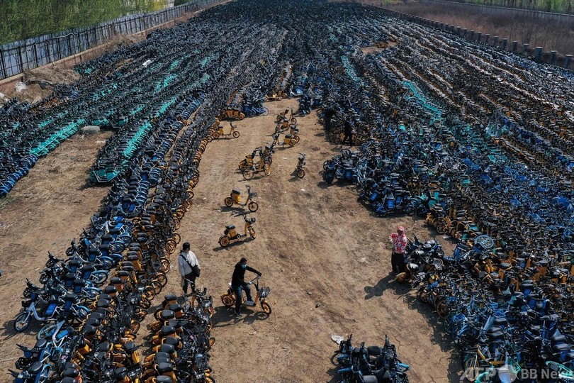 打ち捨てられた自転車には、ハローバイク(Hellobike)、滴滴(Didi)、美団(Meituan)など、同国のシェアサイクル事業を独占した企業のロゴが見える。