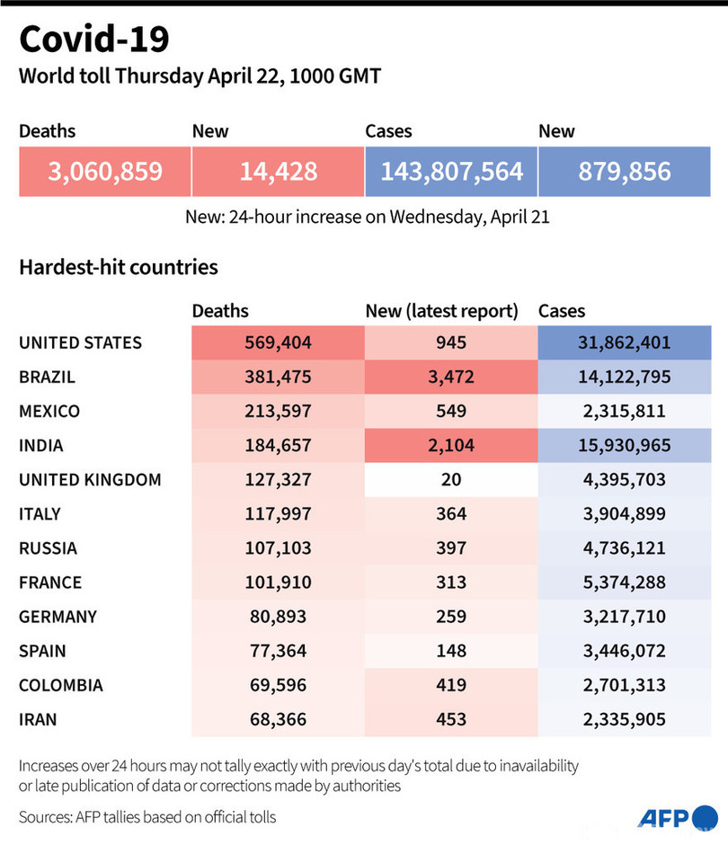 【4月22日 AFP】AFPが各国当局の発表に基づき日本時間22日午後7時にまとめた統計によると、世界の新型コロナウイルスによる死者数は306万859人に増加した。