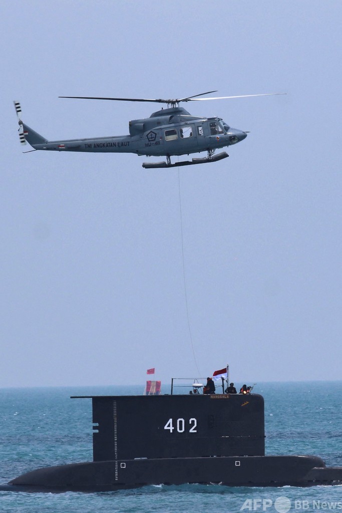 インドネシア軍は22日、水深50~100メートルで磁気反応を探知したと発表。ナンガラ402の可能性もあるが、艦内の酸素が尽きたとみられることから、最悪の事態も懸念されている。(c)AFP