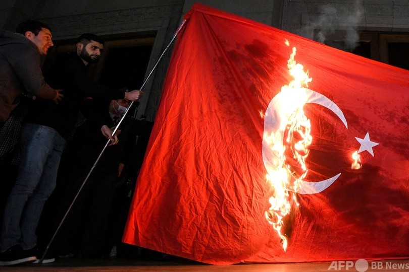 アルメニアはオスマン帝国末期に最大150万人のアルメニア人が殺害されたとしており、これをジェノサイド(集団虐殺)と認定するよう世界に向けて強く主張してきたが、オスマン帝国の後継国家であるトルコはジェノサイドと呼ぶことを強硬に拒否している。23日のエレバン市内では、トルコの国旗に火を付ける人々の姿も見られた。(c)AFP
