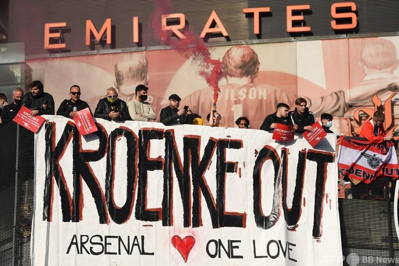 アーセナルでも、23日のエバートン(Everton)戦前に約2000人のファンがスタン・クロンケ(Stan Kroenke)オーナーに抗議し、オーナーを吸血鬼や悪魔として描いたカードを掲げるファンもいた。