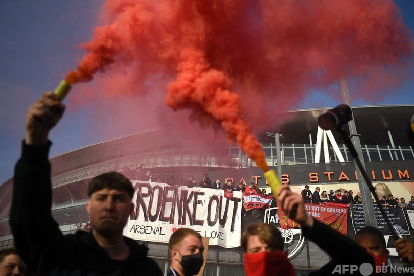 アーセナルでも、23日のエバートン(Everton)戦前に約2000人のファンがスタン・クロンケ(Stan Kroenke)オーナーに抗議し、オーナーを吸血鬼や悪魔として描いたカードを掲げるファンもいた。