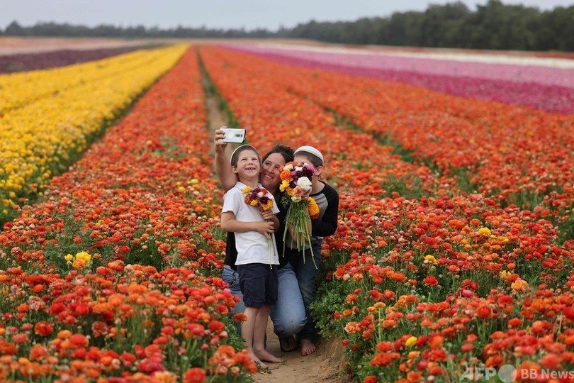 【4月29日 AFP】イスラエル南部、パレスチナ自治区ガザ地区(Gaza Strip)との境界に近いキブツ(農業共同体)「ニルイツハク(Nir Yitzhak)」で先週、ラナンキュラスが見頃を迎えた。兵士や家族らが花を摘んだりして楽しむ様子がみられた。(c)AFP