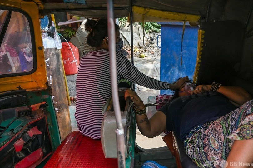 【4月29日 AFP】インドの首都ニューデリー近郊ガジアバード(Ghaziabad)にある混雑した道路のわきで、ヒマンシュ・ベルマ(Himanshu Verma)さん(32)は、新型コロナウイルスに感染した母親(58)の顔にマスクが当てられ、酸素吸入が始まると、安堵(あんど)のため息をついた。