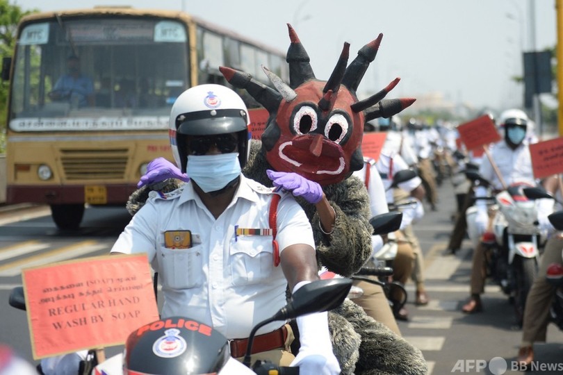 【4月30日 AFP】インド・チェンナイ(Chennai)で29日、新型コロナウイルス啓発イベントが開かれた。バイクに乗った警官隊がプラカードを手に行進したり、新型ウイルスに似た悪魔に扮(ふん)した警官がパフォーマンスをしたりした。(c)AFP