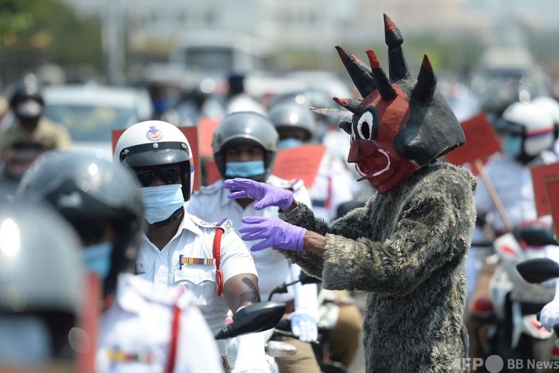 【4月30日 AFP】インド・チェンナイ(Chennai)で29日、新型コロナウイルス啓発イベントが開かれた。バイクに乗った警官隊がプラカードを手に行進したり、新型ウイルスに似た悪魔に扮(ふん)した警官がパフォーマンスをしたりした。(c)AFP