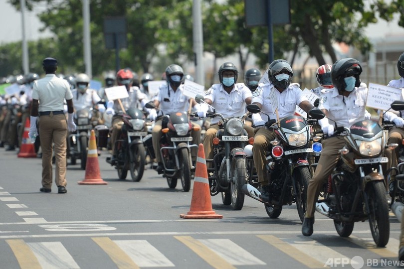 【4月30日 AFP】インド・チェンナイ(Chennai)で29日、新型コロナウイルス啓発イベントが開かれた。バイクに乗った警官隊がプラカードを手に行進したり、新型ウイルスに似た悪魔に扮(ふん)した警官がパフォーマンスをしたりした。(c)AFP