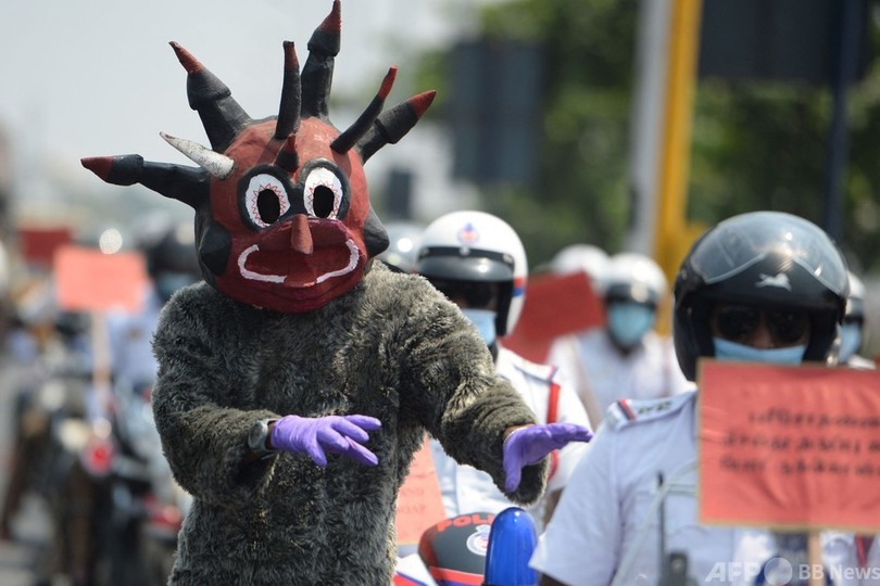 【4月30日 AFP】インド・チェンナイ(Chennai)で29日、新型コロナウイルス啓発イベントが開かれた。バイクに乗った警官隊がプラカードを手に行進したり、新型ウイルスに似た悪魔に扮(ふん)した警官がパフォーマンスをしたりした。(c)AFP