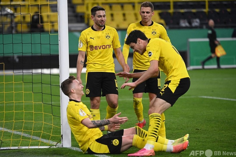 キャプテンのマルコ・ロイス(Marco Reus)は、独公共放送のARDで「ゴール前での確実性が非常に高かった。ほとんどすべてのシュートが得点になった」と振り返り、「決勝にたどり着くことができとても満足している」と喜んだ。(c)AFP