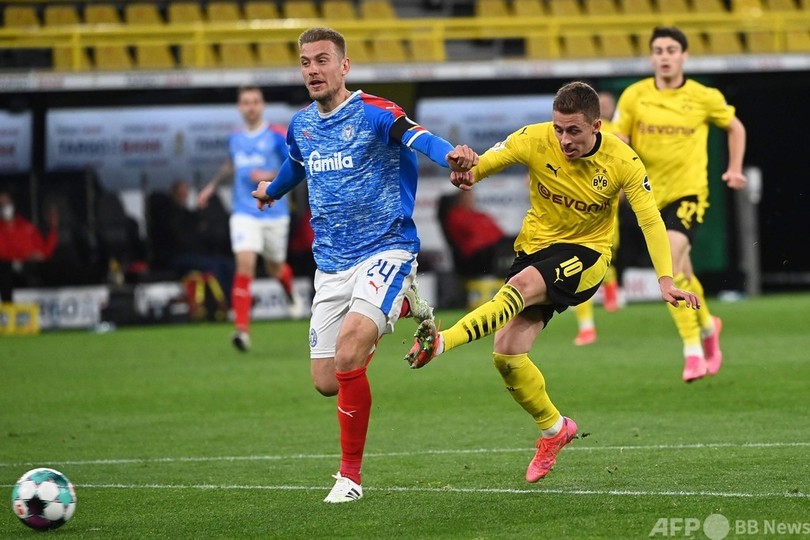 【5月2日 AFP】サッカードイツカップ(German Cup 2020-21)は1日、準決勝の試合が行われ、ボルシア・ドルトムント(Borussia Dortmund)はチーム得点王のアーリング・ブラウト・ハーランド(Erling Braut Haaland)が欠場した影響を感じさせず、2部ホルシュタイン・キール(Holstein Kiel)を5-0で退けて決勝に進んだ。