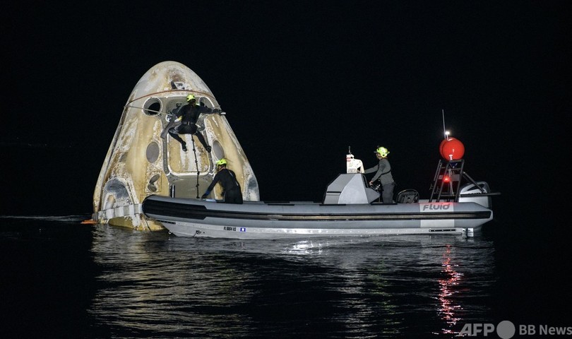 【5月2日 AFP】(更新、写真追加)米航空宇宙局(NASA)の中継映像によると、日本人宇宙飛行士の野口聡一(Soichi Noguchi)さんら4人を乗せた米宇宙開発企業スペースX(SpaceX)の有人宇宙船クルードラゴン(Crew Dragon)は2日、米フロリダ州パナマシティー(Panama City)沖に着水した。