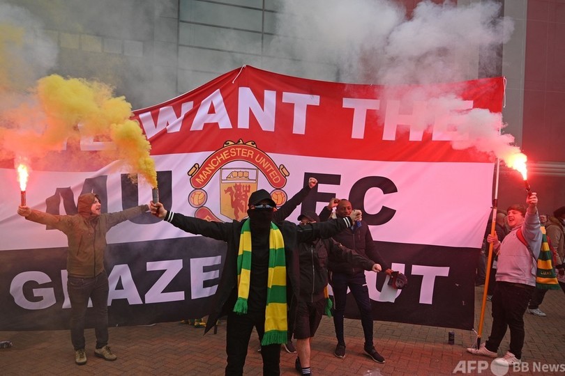 ユナイテッドでは、欧州スーパーリーグ構想に賛同した経営陣に対してファンの怒りが再燃している。4月に発表されたスーパーリーグ構想は、ファンや選手、政府、統括団体の猛反発に遭い、わずか48時間で事実上の崩壊に追い込まれた。(c)AFP