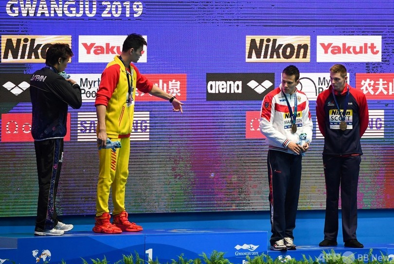 1500メートル自由形の世界記録保持者である孫は、同大会の200メートルと400メートルの自由形で優勝したが、ドーピング違反の過去があることから表彰台では他の選手からの抗議行動に遭った。(c)AFP