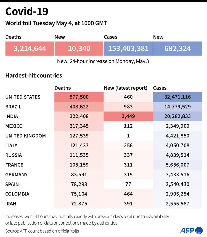 【5月4日 AFP】AFPが各国当局の発表に基づき日本時間4日午後7時にまとめた統計によると、世界の新型コロナウイルスによる死者数は321万4644人に増加した。