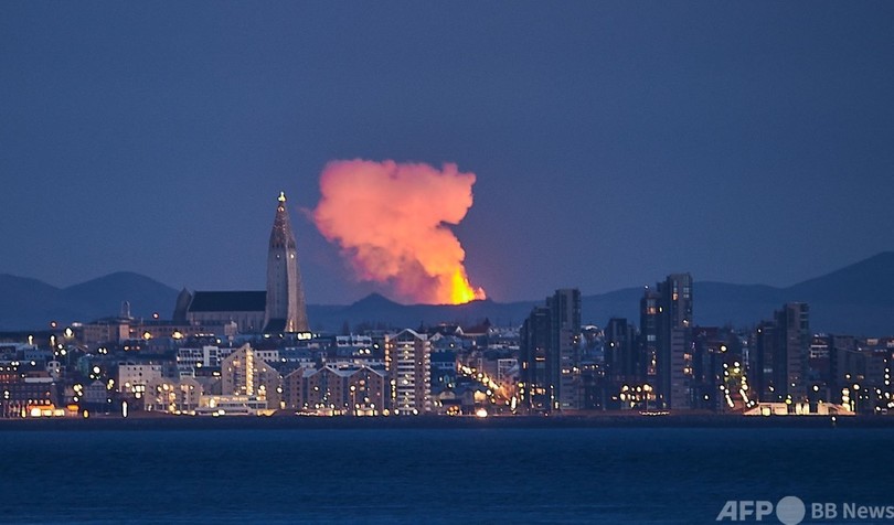 3月19日に始まった噴火は、しばらく落ち着いた状態が続いていたが、先週末に突然活発化。亀裂から高さ300メートルまで溶岩が噴出し、その様子は首都レイキャビクからも確認できた。(c)AFP