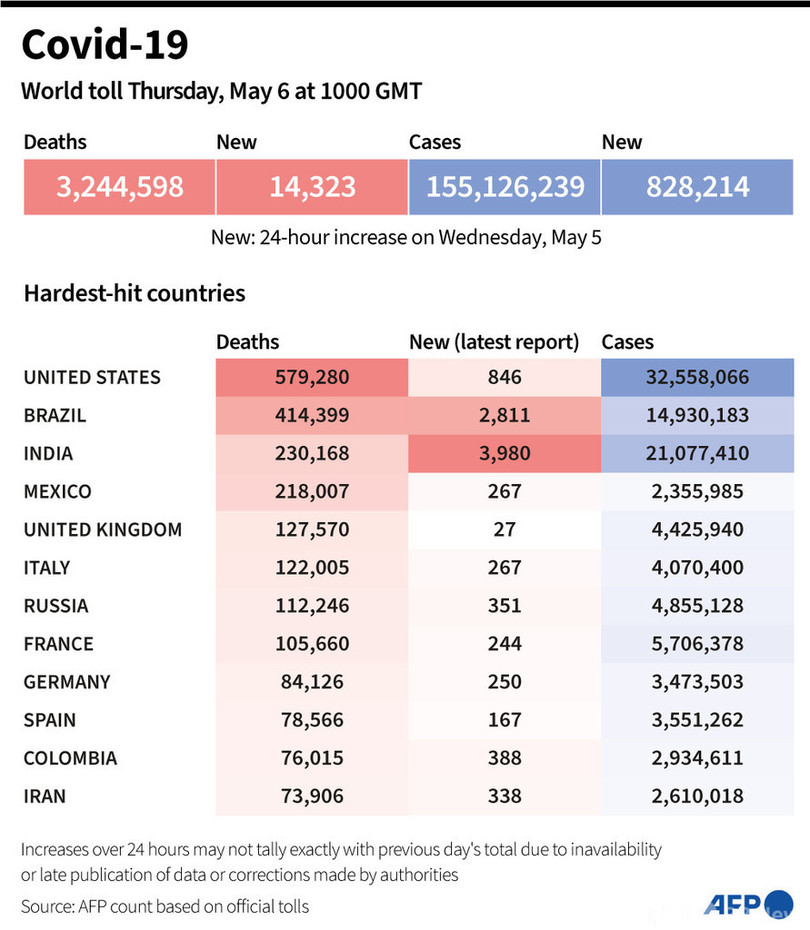【5月6日 AFP】AFPが各国当局の発表に基づき日本時間6日午後7時にまとめた統計によると、世界の新型コロナウイルスによる死者数は324万4598人に増加した。