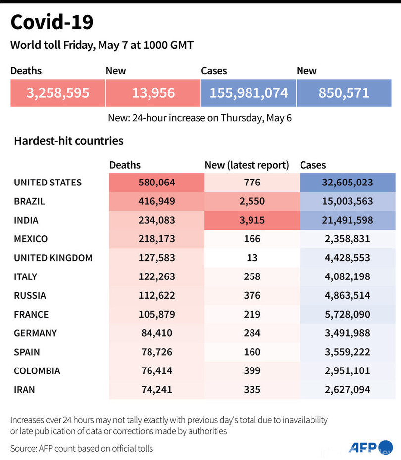 【5月7日 AFP】AFPが各国当局の発表に基づき日本時間7日午後7時にまとめた統計によると、世界の新型コロナウイルスによる死者数は325万8595人に増加した。