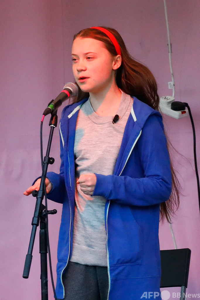 髪を編んだトゥンベリさんが写っている2枚目は、2018年にベルギーのブリュッセルで撮影された動画を加工したもので、元の動画はグーグル(Google)でも検索できる。(c)AFP