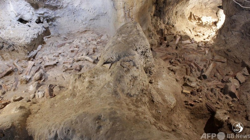 ゾウやサイ、オオツノジカ、ホラアナグマ、野生ウマ、絶滅したウシ属のオーロックスなど、大型哺乳類の骨も見つかっている。文化財省によると、骨の多くにはかじった明確な跡が残されていた。(c)AFP