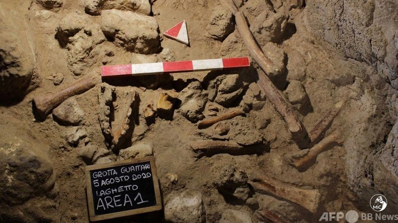 ゾウやサイ、オオツノジカ、ホラアナグマ、野生ウマ、絶滅したウシ属のオーロックスなど、大型哺乳類の骨も見つかっている。文化財省によると、骨の多くにはかじった明確な跡が残されていた。(c)AFP