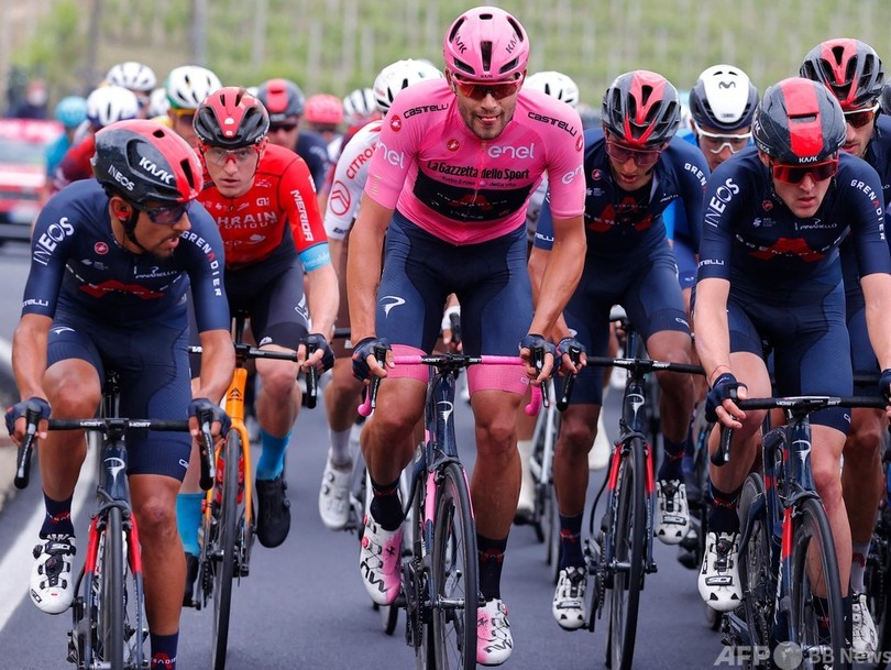 総合争いで本命視されているチーム・バイクエクスチェンジ(Team BikeExchange)のサイモン・イェーツ(Simon Yates、英国)とイネオス・グレナディアーズのエガン・ベルナル(Egan Bernal、コロンビア)は、難なく2位集団でフィニッシュしている。(c)AFP