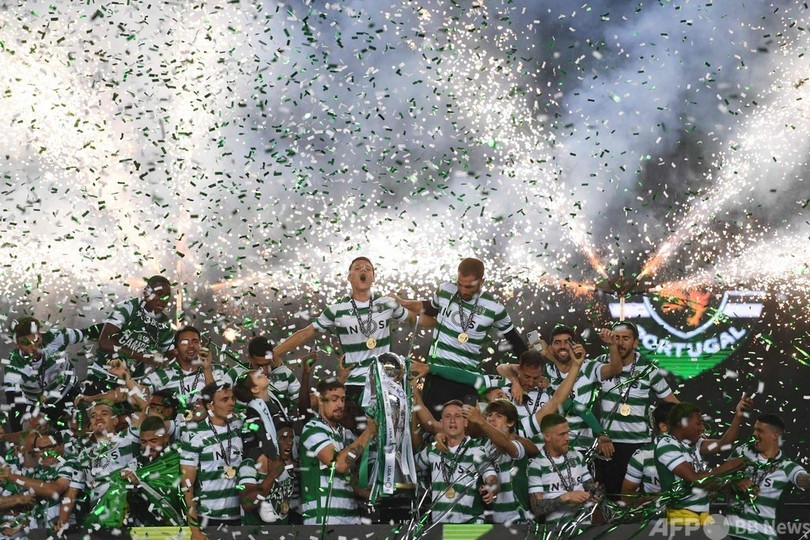 この勝利でスポルティングは、今季2試合を残して昨季王者で現在2位につけるFCポルト(FC Porto)との勝ち点差を8に開き、19季ぶりのタイトルを手にした。(c)AFP