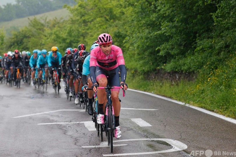 一方のデマルキは前日までトップに立っていたイネオス・グレナディアーズ(Ineos Grenadiers)のフィリッポ・ガンナ(Filippo Ganna、イタリア)を抜き、5回目のジロで34歳にして初めて総合首位のマリアローザ(ピンクジャージー)をまとうことになった。ドンブロウスキーが22秒差の総合2位につけている。(c)AFP