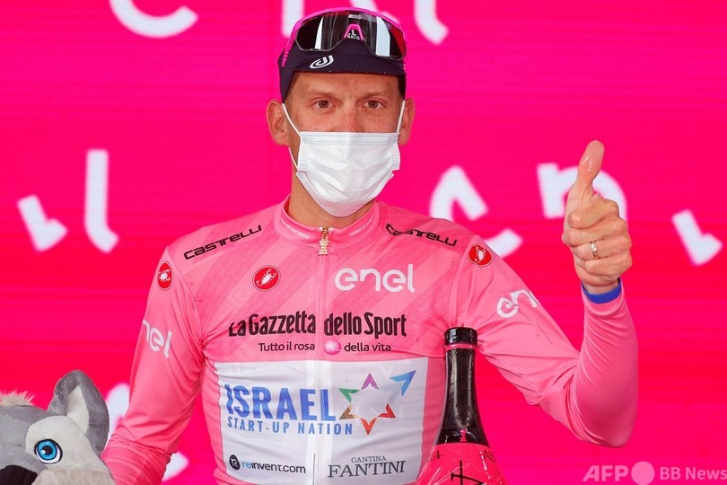 一方のデマルキは前日までトップに立っていたイネオス・グレナディアーズ(Ineos Grenadiers)のフィリッポ・ガンナ(Filippo Ganna、イタリア)を抜き、5回目のジロで34歳にして初めて総合首位のマリアローザ(ピンクジャージー)をまとうことになった。ドンブロウスキーが22秒差の総合2位につけている。(c)AFP