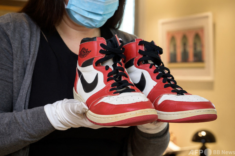 今回競売に出されたのは赤、白、黒のシカゴ・ブルズ(Chicago Bulls)カラーのシューズで、輝かしいデビューを飾った1984-85シーズンにジョーダン氏が着用した。現在58歳のジョーダン氏は、通算6度のNBAファイナル制覇を果たし、史上最高の選手と評価されている。(c)AFP/Robin MILLARD