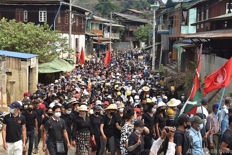現地監視団体によると、アウン・サン・スー・チー(Aung San Suu Kyi)国家顧問ら民主派が追放された軍事クーデター以降、ミャンマーでは大規模な抗議デモが続いている。これまでに780人以上が治安部隊によって殺害された。少なくとも80人の記者・カメラマンが拘束され、うち45人はいまだ解放されていない。(c)AFP