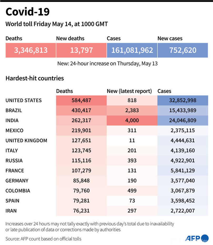 【5月15日 AFP】AFPが各国当局の発表に基づき日本時間14日午後7時にまとめた統計によると、世界の新型コロナウイルスによる死者数は334万6813人に増加した。