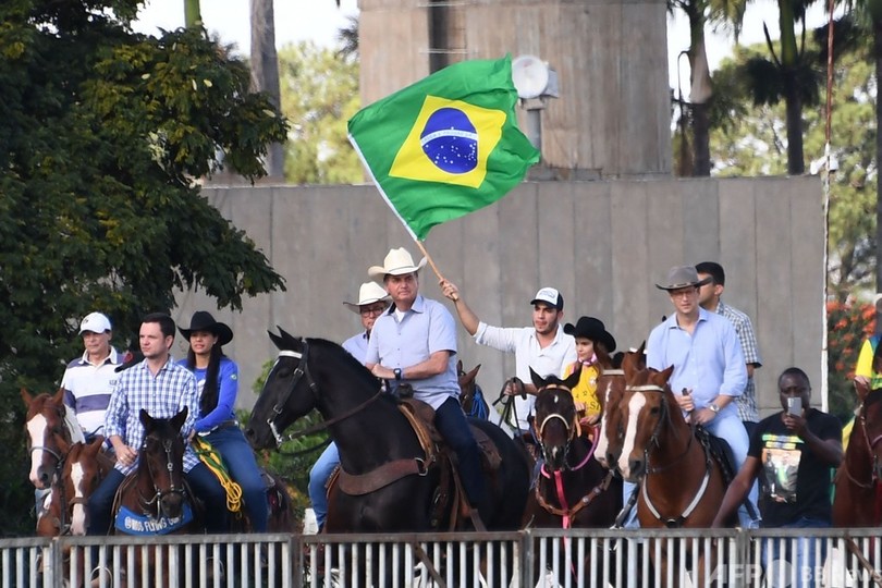 【5月16日 AFP】新型コロナウイルス対策で厳しい批判にさらされ、支持率が低下しているブラジルのジャイル・ボルソナロ(Jair Bolsonaro)大統領が15日、新型コロナ対策の中止を訴えるデモに参加した。ボルソナロ氏は会場上空を飛ぶヘリコプターから手を振り、馬に乗って登場。首都ブラジリアの官庁街(Esplanade of Ministries)に集まった数万人の聴衆を沸かせた。