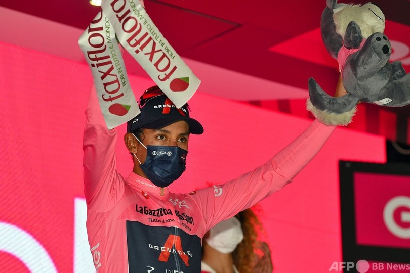 イネオス・グレナディアーズ(Ineos Grenadiers)のエガン・ベルナル(Egan Bernal、コロンビア)は先頭集団の中でフィニッシュし、総合首位のマリアローザ(ピンクジャージー)を堅持。アスタナ(Astana Pro Team)のアレクサンドル・ブラソフ(Aleksandr Vlasov、ロシア)も一緒にゴールを通過し、ベルナルから45秒差の同2位につけている。(c)AFP