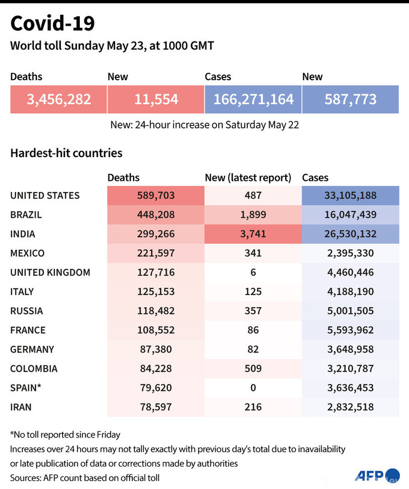 【5月24日 AFP】AFPが各国当局の発表に基づき日本時間23日午後7時にまとめた統計によると、世界の新型コロナウイルスによる死者数は345万6282人に増加した。