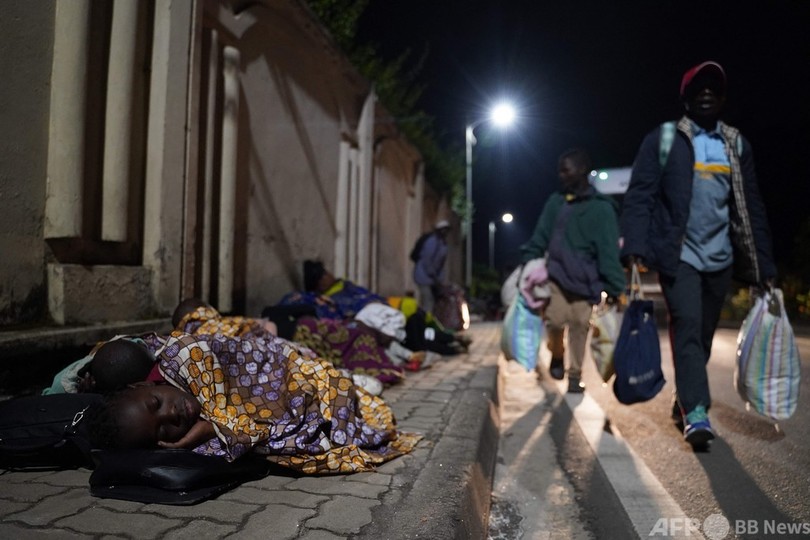 22日夜は、アフリカで最も火山活動が活発なニーラゴンゴ火山の噴火で夜空が赤く染まる中、多数の家族が家から持ち出した身の回りの品を並べた歩道で寝た。一人の住民は「何もかも失った」と話し、そういう市民が何百人もいると続けた。(c)AFP/Albert Kambale / Justin Katimwa