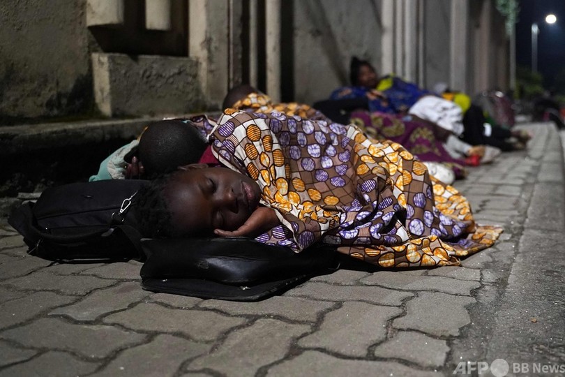 22日夜は、アフリカで最も火山活動が活発なニーラゴンゴ火山の噴火で夜空が赤く染まる中、多数の家族が家から持ち出した身の回りの品を並べた歩道で寝た。一人の住民は「何もかも失った」と話し、そういう市民が何百人もいると続けた。(c)AFP/Albert Kambale / Justin Katimwa