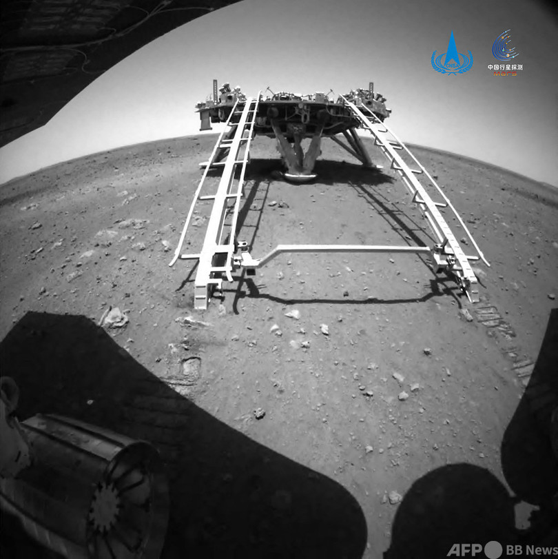 ニュース 環境・科学 中国、火星地表の探査開始 画像公開 2021年5月24日 13:13 発信地:中国 [ 中国 中国・台湾 宇宙 例外 ] このニュースをシェア ‹ › ❮ 1/2 ❯ 中国の火星探査車「祝融」が撮影した探査機「天問1号」の着陸機。中国国家航天局(CNSA)公開(2021年5月22日公開)。(c)AFP PHOTO / CNSA 画像作成中 ! 【5月24日 AFP】中国の火星探査車「祝融(Zhurong)」が22日、地表に降りて探査を開始した。祝融が撮影し、中国国家航天局(CNSA)が公開した画像では、祝融が探査機「天問1号(Tianwen-1)」の着陸機からランプ(傾斜路)を伝って地表に降りる様子や、地表に着いた後に撮影した着陸機が確認できる。 探査車は15日、「天問1号」に搭載されて火星に着陸した。最初の火星ミッションで探査機着陸に成功した国は中国が初めて。(c)AFP 環境・科学 一覧へ> メディア・報道関係・法人の方向け 写真・動画 購入のお問合せ>