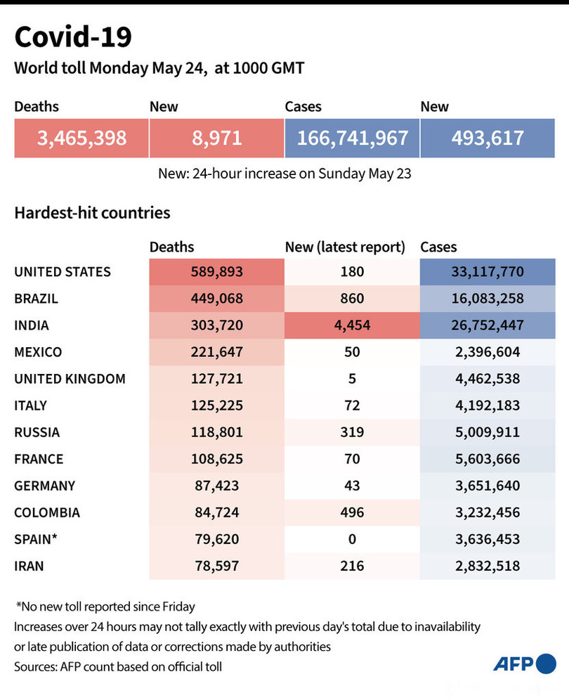 【5月25日 AFP】AFPが各国当局の発表に基づき日本時間24日午後7時にまとめた統計によると、世界の新型コロナウイルスによる死者数は346万5398人に増加した。