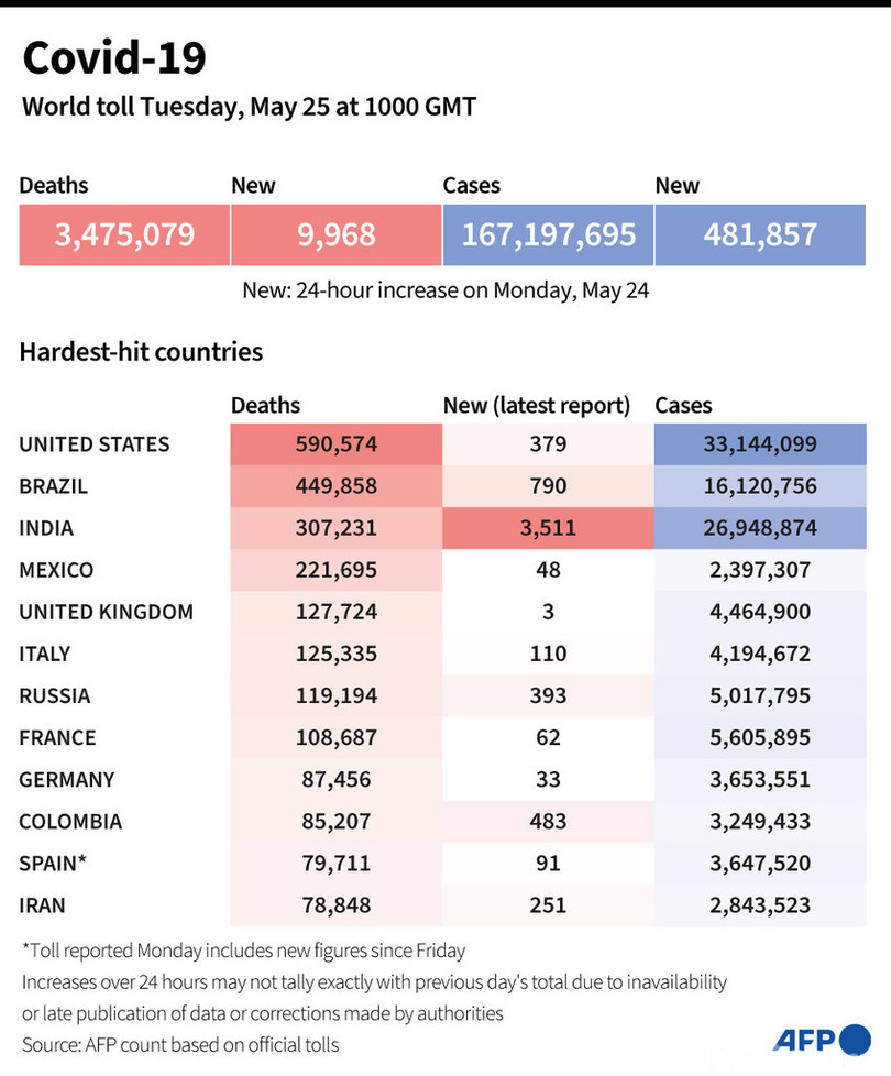 【5月26日 AFP】AFPが各国当局の発表に基づき日本時間25日午後7時にまとめた統計によると、世界の新型コロナウイルスによる死者数は347万5079人に増加した。