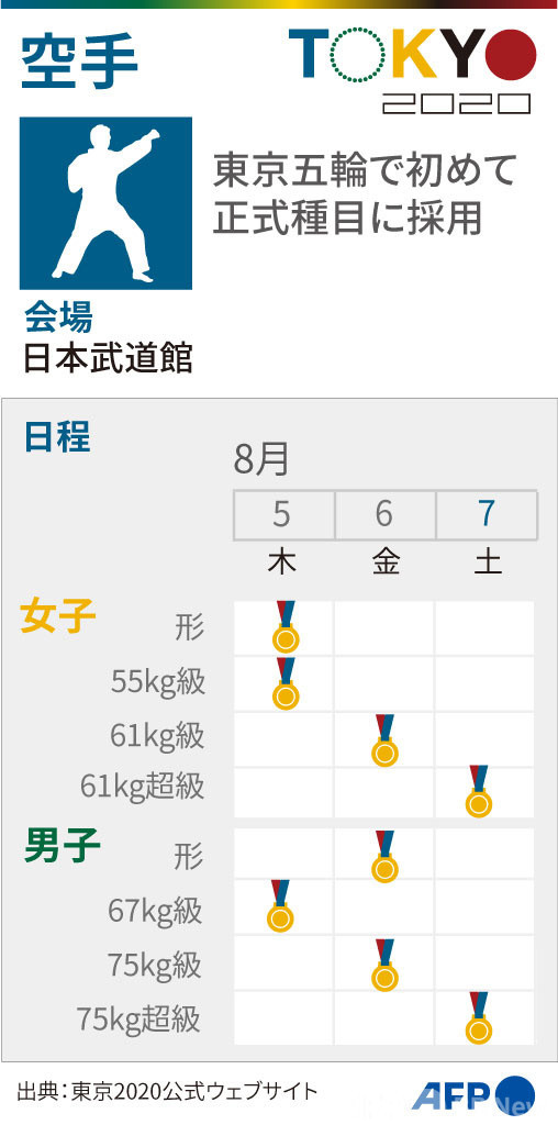 スポーツ スポーツ その他 特集:東京五輪2020 東京五輪:追加競技 AFPBB コンテンツ 図解 東京五輪:その他 競技 【図解】東京五輪、空手の競技日程 2021年5月9日 6:00 発信地:東京 [ 日本 アジア・オセアニア ] このニュースをシェア 東京五輪、空手の競技日程についてまとめた図解。(c)AFP 【5月9日 AFP】東京五輪で初めて正式種目に採用された空手の競技日程を図解でまとめた。 空手は日本武道館(Nippon Budokan)で8月5日から7日までの日程で予定されている。(c)AFP 特集:東京五輪2020 8/8に閉幕。日本勢は金メダル27個を含む史上最多となる計58個のメダルを獲得した。 スポーツ その他 一覧へ> メディア・報道関係・法人の方向け 写真・動画 購入のお問合せ>