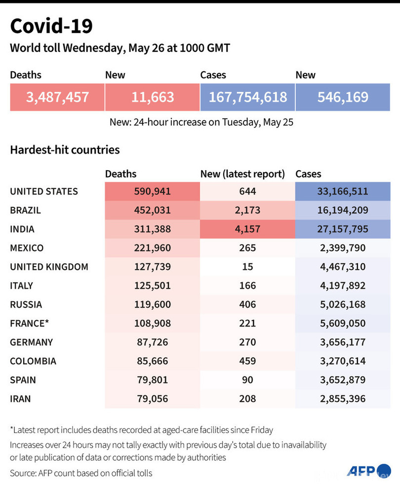【5月27日 AFP】AFPが各国当局の発表に基づき日本時間26日午後7時にまとめた統計によると、世界の新型コロナウイルスによる死者数は348万7457人に増加した。
