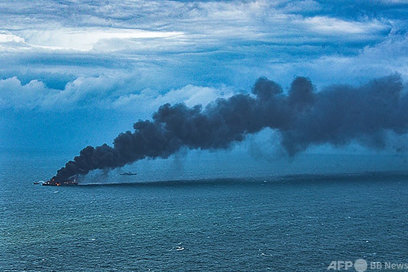 インド東部に上陸したサイクロンに伴う強風により、消火作業は難航。船体からは大きな黒煙が立ち上っている。スリランカ空軍は26日、ヘリコプターで難燃剤約425キロを散布。スリランカの海洋環境保護局(MEPA)は、化学物質や燃料が流出する事態に備え、封じ込め措置を準備していると発表した。(c)AFP