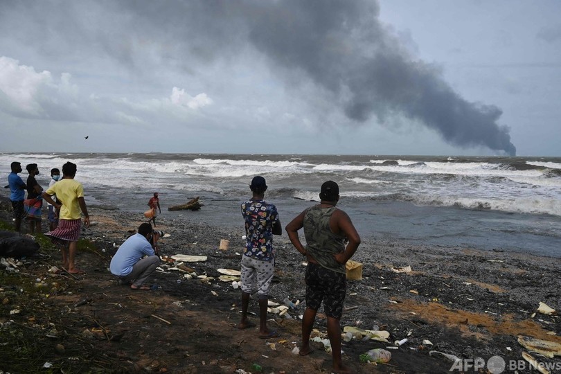 インド東部に上陸したサイクロンに伴う強風により、消火作業は難航。船体からは大きな黒煙が立ち上っている。スリランカ空軍は26日、ヘリコプターで難燃剤約425キロを散布。スリランカの海洋環境保護局(MEPA)は、化学物質や燃料が流出する事態に備え、封じ込め措置を準備していると発表した。(c)AFP