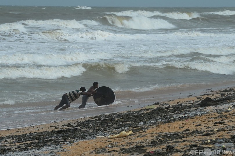 インド東部に上陸したサイクロンに伴う強風により、消火作業は難航。船体からは大きな黒煙が立ち上っている。スリランカ空軍は26日、ヘリコプターで難燃剤約425キロを散布。スリランカの海洋環境保護局(MEPA)は、化学物質や燃料が流出する事態に備え、封じ込め措置を準備していると発表した。(c)AFP