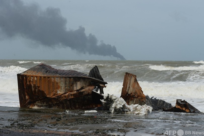 インド東部に上陸したサイクロンに伴う強風により、消火作業は難航。船体からは大きな黒煙が立ち上っている。スリランカ空軍は26日、ヘリコプターで難燃剤約425キロを散布。スリランカの海洋環境保護局(MEPA)は、化学物質や燃料が流出する事態に備え、封じ込め措置を準備していると発表した。(c)AFP
