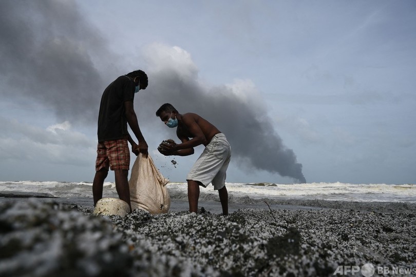 インド東部に上陸したサイクロンに伴う強風により、消火作業は難航。船体からは大きな黒煙が立ち上っている。スリランカ空軍は26日、ヘリコプターで難燃剤約425キロを散布。スリランカの海洋環境保護局(MEPA)は、化学物質や燃料が流出する事態に備え、封じ込め措置を準備していると発表した。(c)AFP